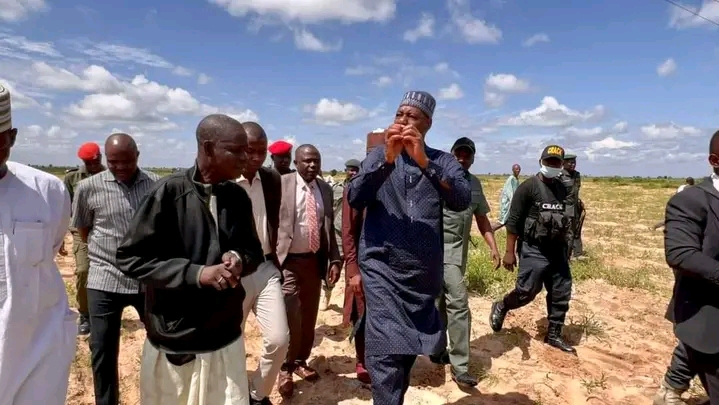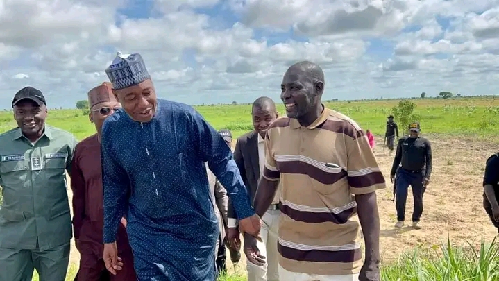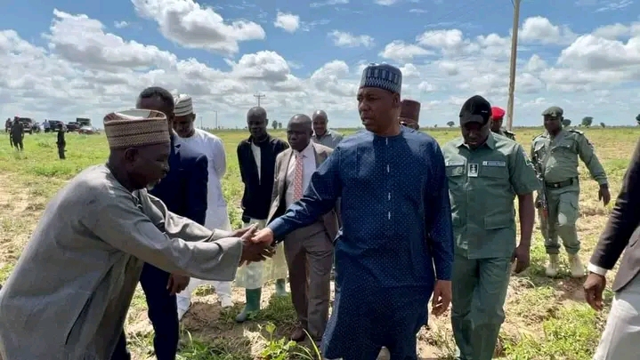 Gwamnan jihar Borno, Farfesa Babagana Umara Zulum a lokacin da ya kai ziyara har gonaki goma na talakawan jihar sa a ƙananan hukumomi huɗu, inda ya tattauna da su on jin matsalalolin da suke son gwamnati ta taimaka musu wurin magancewa.
